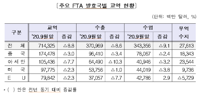 FTA ÁÖ¿ä ±¹°¡µé°úÀÇ ±³¿ªµµ ÀüüÀûÀ¸·Î ÁÙ¾îµç °ÍÀ¸·Î º¸¿©Áø´Ù.
