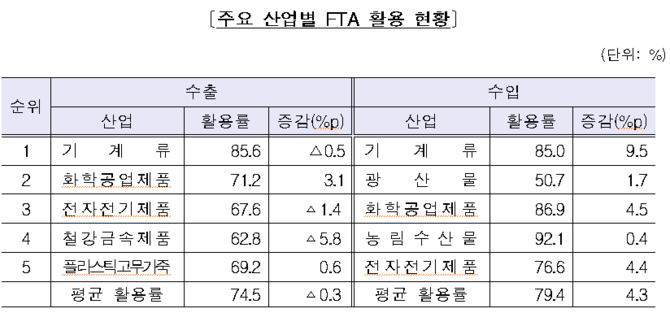 ÁÖ¿ä »ê¾÷ÀÇ FTA ¼öÃâȰ¿ë·üÀº ÈÇаø¾÷Á¦Ç°ÀÌ 3.1%Æ÷ÀÎÆ® °¡Àå Å©°Ô Áõ°¡Çß°í, ¼öÀÔȰ¿ë·üÀº ±â°è·ù°¡ 9.5%Æ÷ÀÎÆ® ±ÞÁõÇØ ´«¿¡ ¶è´Ù.