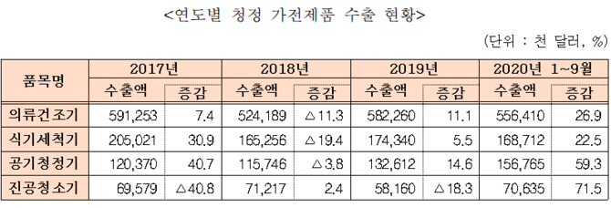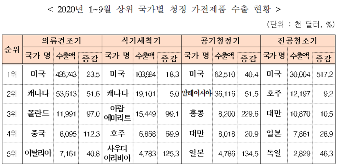 ¿ÃÇØ µé¾î ¼öÃâÀÌ Áõ°¡ÇÑ ÁÖ¿ä ûÁ¤°¡ÀüÀÇ ÃÖ´ë ¼öÃâ±¹Àº ¹Ì±¹ÀÌ´Ù. ÀÇ·ù°ÇÁ¶±â(76.7%), ½Ä±â¼¼Ã´±â(61.6%), °ø±âûÁ¤±â(39.9%), Áø°øÃ»¼Ò±â(42.5%) ¸ðµÎ ¹Ì±¹¿¡ °¡Àå ¸¹ÀÌ ¼öÃâµÇ°í ÀÖ´Ù.