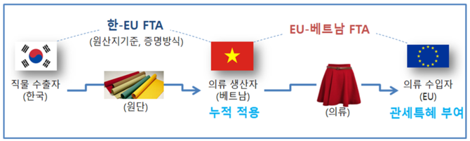 EVFTA ´©Àû±ÔÁ¤¿¡ µû¶ó º£Æ®³²¿¡¼ »ý»êÇØ¼ EU·Î ¼öÃâµÇ´Â ÀÇ·ù¿¡ °áÇյǰųª Ãß°¡ °¡°øµÈ Çѱ¹»ê Á÷¹°(fabrics)À» º£Æ®³²»êÀ¸·Î °£ÁÖÇØ FTA °ü¼¼ÇýÅÃÀÌ ÁÖ¾îÁø´Ù.