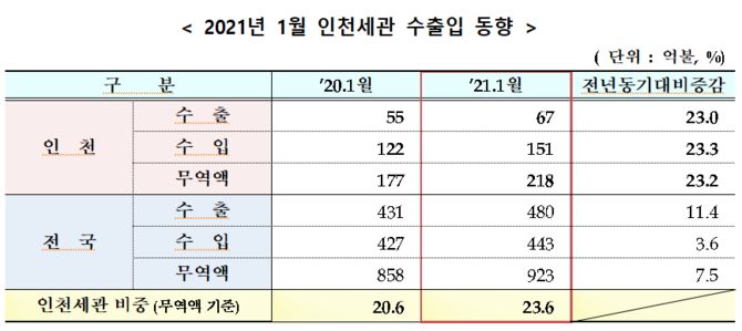 ÀÎõÇ×ÀÇ ¼öÃâ¾×Àº Àü³â µ¿±â´ëºñ 3.4% Áõ°¡ÇÑ 22¾ïºÒ·Î Áý°èµÆ´Ù. ¹«¿ª¾×Àº 3.7% Áõ°¡ÇÑ 87¾ïºÒÀÌ´Ù. ¼öÀÔ¾×Àº 3.7% Áõ°¡ÇØ 65¾ïºÒÀ» ±â·ÏÇß´Ù.