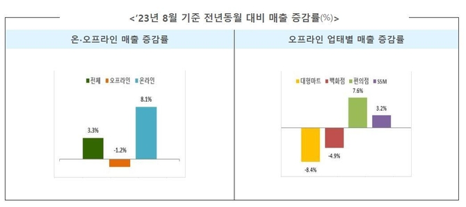 (Á¶¼¼±ÝÀ¶½Å¹®=¾ÈÁ¾¸í ±âÀÚ) »ê¾÷ÀÚ¿øÅë»êºÎ´Â 23³â 8¿ù ÁÖ¿ä À¯Åë¾÷ü ¸ÅÃâ Áß ¿ÀÇÁ¶óÀÎÀÌ -1.2% °¨¼ÒÇß°í, ¿Â¶óÀÎÀº 8.1% Áõ°¡ÇÏ¸é¼ Àü³â µ¿¿ù ´ëºñ 3.3% Áõ°¡ÇÑ °ÍÀ¸·Î ³ªÅ¸³µ´Ù°í Áö³ 28ÀÏ ¹àÇû´Ù.