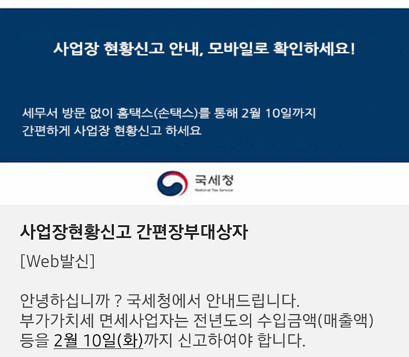 ¾È³»¸¦ ¹ÞÀº »ç¾÷ÀÚ´Â ±¹¼¼Ã» ȨÅýº ¶Ç´Â ¸ð¹ÙÀÏ ¼ÕÅýº¿¡¼ ½Å°íµµ¿òÀÚ·á, ¹Ì¸®Ã¤¿ò ¼ºñ½º µîÀ» ÅëÇØ ¼Õ½±°Ô ½Å°í¸¦ ¸¶Ä¥ ¼ö ÀÖ´Ù.