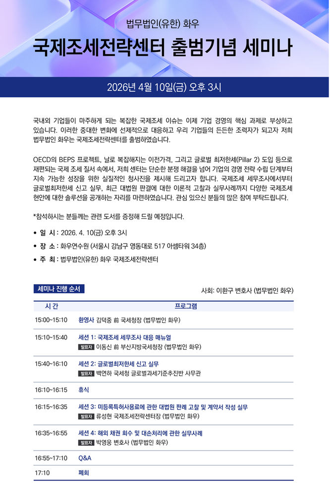 À̹ø ¼¼¹Ì³ª´Â OECDÀÇ BEPS(¼ÒµæÀÌÀü ¹× ¼¼¿øÀá½Ä) ÇÁ·ÎÁ§Æ®, ±Û·Î¹ú ÃÖÀúÇѼ¼(Pillar 2) µµÀÔ µî ±Þº¯ÇÏ´Â ±¹Á¦ Á¶¼¼ Áú¼¿¡ ´ëÀÀÇØ ¿ì¸® ±â¾÷µé¿¡°Ô ½ÇÁúÀûÀÎ Àü·«À» Á¦½ÃÇϱâ À§ÇØ ¸¶·ÃµÆ´Ù.