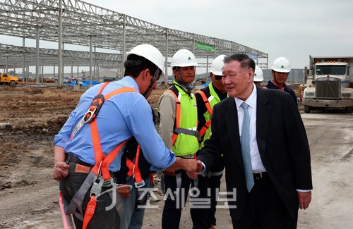 ¡ß¡¦Á¤¸ù±¸ Çö´ëÂ÷±×·ì ȸÀåÀÌ 26ÀÏ(Çѱ¹½Ã°¢) ±â¾ÆÂ÷ ¸ß½ÃÄÚ °øÀåÀ» ¹æ¹®ÇØ °øÀå °Ç¼³ÇöÀåÀÇ ±Ù·ÎÀÚµéÀ» °Ý·ÁÇϰí ÀÖ´Ù.