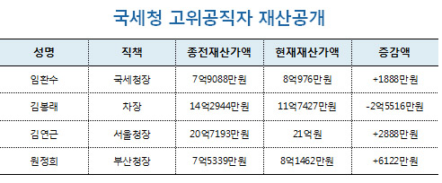 ±è¿¬±Ù ¼¿ïÁö¹æ±¹¼¼Ã»ÀåÀº ¹®ÁßÀç»êÀ» »ó¼Ó¹Þ¾Æ Àç»êÀÌ ´Ã¾úÁö¸¸ ÀÓȯ¼ö ±¹¼¼Ã»ÀåÀº º»ÀÎÀÌ ¼ÒÀ¯ÇÑ ¾ÆÆÄÆ®ÀÇ °¡°ÝÀÌ ¶³¾îÁö´Â ¾ÆÇÄ(?)À» °Þ¾ú´Ù. Á¤ºÎ°øÁ÷ÀÚÀ±¸®À§¿øÈ¸°¡ 26ÀÏ ¹ßÇ¥ÇÑ '2015³âµµ Á¤±â Àç»êº¯µ¿»çÇ× ½Å°í³»¿ª'¿¡ µû¸£¸é ÀÓ ±¹¼¼Ã»ÀåÀº º»ÀÎ ¼ÒÀ¯ÀÇ ¾ÆÆÄÆ®°¡ °¡¾×ÀÌ ¶³¾îÁ³Áö¸¸ ¿ù±ÞÀ» Â÷°îÂ÷°î ¸ð¾Æ Àü³âº¸´Ù 1888¸¸¿ø ´Ã¾î³ 8¾ï976¸¸¿øÀÇ Àç»êÀ» ½Å°íÇß´Ù. ÀÓ ±¹¼¼Ã»ÀåÀÇ Àç»êÀº ´Ù¸¥ °íÀ§Á÷º¸´Ù´Â ´ÜÃÍÇÑ ÆíÀ̾ú´Ù. º»ÀÎ ¼ÒÀ¯ ¾ÆÆÄÆ® 1ä¿Í ¹è¿ìÀÚ ¸íÀÇ·Î µÈ 2010³â½Ä ¶ó¼¼Æ¼(122¸¸¿ø), 2014³â½Ä ¾ËÆä¿Â(3038¸¸¿ø) µî Â÷·® 2´ë, ¿¹±Ý(1¾ï7154¸¸¿ø)ÀÌ ÀüºÎ¿´´Ù. ÀÓ ±¹¼¼Ã»ÀåÀÌ ¼ÒÀ¯ÇÑ ¼¿ï °³² ´ëÄ¡µ¿ÀÇ ¾ÆÆÄÆ®´Â ±âÁ¸ 6¾ï1100¸¸¿øÀ̾úÁö¸¸ À̹ø Àç»ê½Å°í ¶§ 5¾ï9900¸¸¿øÀ¸·Î °¡¾×ÀÌ 1200¸¸¿ø Ç϶ôÇß´Ù. ¹Ý¸é º»ÀÎ ¼ÒÀ¯ÀÇ ¿¹±ÝÀº 1600¸¸¿øÀÌ Áõ°¡, ÀÓ ±¹¼¼Ã»ÀåÀº ¿ù±ÞÀ» ²ÙÁØÈ÷ ¸ð¾Æ ¿¹±ÝÀÌ ´Ã¾î³µ´Ù°í ¼³¸íÇß´Ù. ´Ù¸¸ ¹è¿ìÀÚ ¼ÒÀ¯ÀÇ ¿¹±ÝÀº 1400¸¸¿ø °¨¼ÒÇß´Ù. ±èºÀ·¡ ±¹¼¼Ã» Â÷ÀåÀÇ Àç»êÀº 11¾ï7427¸¸¿øÀ¸·Î ÀÓ ±¹¼¼Ã»À庸´Ù 2¾ï7000¸¸¿ø ¸¹¾ÒÁö¸¸ ÃÖ±Ù °áÈ¥ÇÑ Àå³²ÀÌ µ¶¸³À» ÇÏ¸é¼ 2¾ï5516¸¸¿øÀÇ Àç»êÀÌ °¨¼ÒÇß´Ù. ±è Â÷ÀåÀº ¼¿ï °µ¿±¸¿¡ ¾ÆÆÄÆ® 3¾ï1600¸¸¿øÀ» º»ÀÎ ¸íÀÇ·Î ¼ÒÀ¯Çϰí ÀÖÀ¸¸ç ¹è¿ìÀÚ ¸íÀÇ·Î ¼¿ï ¼ÛÆÄ±¸¿¡ ¾ÆÆÄÆ® Àü¼¼ÀÓÂ÷±Ç 6¾ï3000¸¸¿øÀ» ¼ÒÀ¯Çϰí ÀÖ¾ú´Ù. Â÷¼¼´ë ±¹¼¼ÇàÁ¤½Ã½ºÅÛ(TIS) ±¸Ãà ÀÛ¾÷À» ÇÑ »ï¼ºSDSÀÇ ÁÖ½Ä 800ÁÖ(2¾ï3280¸¸¿ø)¸¦ ¹è¿ìÀÚ ¸íÀÇ·Î °®°í ÀÖ¾ú´Ù°¡ Àü·® ¸ÅµµÇÑ Á¡µµ ´«¿¡ ¶ç¾ú´Ù. ±è ¼¿ïûÀåÀº ¹®ÁßÀç»êÀ» Æ÷ÇÔÇÑ °æºÏ »óÁÖÀÇ Àü´ä µîÀ» »ó¼Ó¹ÞÀ¸¸é¼ ÃÑ 21¾ï82¸¸¿øÀ» ½Å°íÇß´Ù. Àü³âº¸´Ù 2888¸¸¿øÀÌ Áõ°¡Çß´Ù. ±è ¼¿ïûÀåÀº Àü´äÀ» »ó¼Ó¹Þ¾Æ ÅäÁöÀç»ê¸¸ 1¾ï3391¸¸¿øÀÌ Áõ°¡ÇßÁö¸¸ °¡Áö°í ÀÖ´ø ÁÖ½Ä µîÀ» ȯ¸ÅÇØ 1¾ï4300¸¸¿øÀÇ Àç»êÀÌ °¨¼ÒÇß´Ù. »ýȰºñ µîÀ¸·Î º»Àΰú ¹è¿ìÀÚ ¼ÒÀ¯ÀÇ ¿¹±ÝÀ» 2¾ï6000¸¸¿øÀ̳ª »ç¿ëÇßÁö¸¸ °á°úÀûÀ¸·Î ¹è¿ìÀÚ°¡ ¼ÒÀ¯ÇÑ ¿¹±ÝÀÌ 2¾ï6000¸¸¿ø ´Ã¾î³ª¸é¼ ¸¶À̳ʽº´Â ¸éÇß´Ù. ±è ¼¿ïûÀåÀº º»Àΰú ¹è¿ìÀÚÀÇ ±Þ¿©¸¦ ¸ðÀº °ÍÀ̶ó°í ¼³¸íÇß´Ù. ¿øÁ¤Èñ ºÎ»êûÀåÀÇ Àç»êÀº Àü³âº¸´Ù 6122¸¸¿ø ´Ã¾î³ 8¾ï1462¸¸¿øÀ» ½Å°íÇß´Ù. Àå³²°ú Àå³à°¡ º¸À¯ÇÑ ¿¹±Ý°ú ÆÝµåÆò°¡¾× µîÀÌ Áõ°¡ÇÏ¸é¼ Àç»êÀÌ ´Ã¾î³µ´Ù. ÇÑÆí Áö³ÇØ ¸» Àλç·Î À̵¿ÇÑ ±èÀç¿õ ÁߺÎûÀå, ±èÇüÁß ´ëÀüûÀå, ½Å¼ö¿ø ±¤ÁÖûÀå, ³²µ¿±¹ ´ë±¸Ã»ÀåÀº À̹ø Á¤±â Àç»ê°ø°³ ¸í´Ü¿¡ Æ÷ÇÔµÇÁö ¾Ê¾Ò´Ù. |