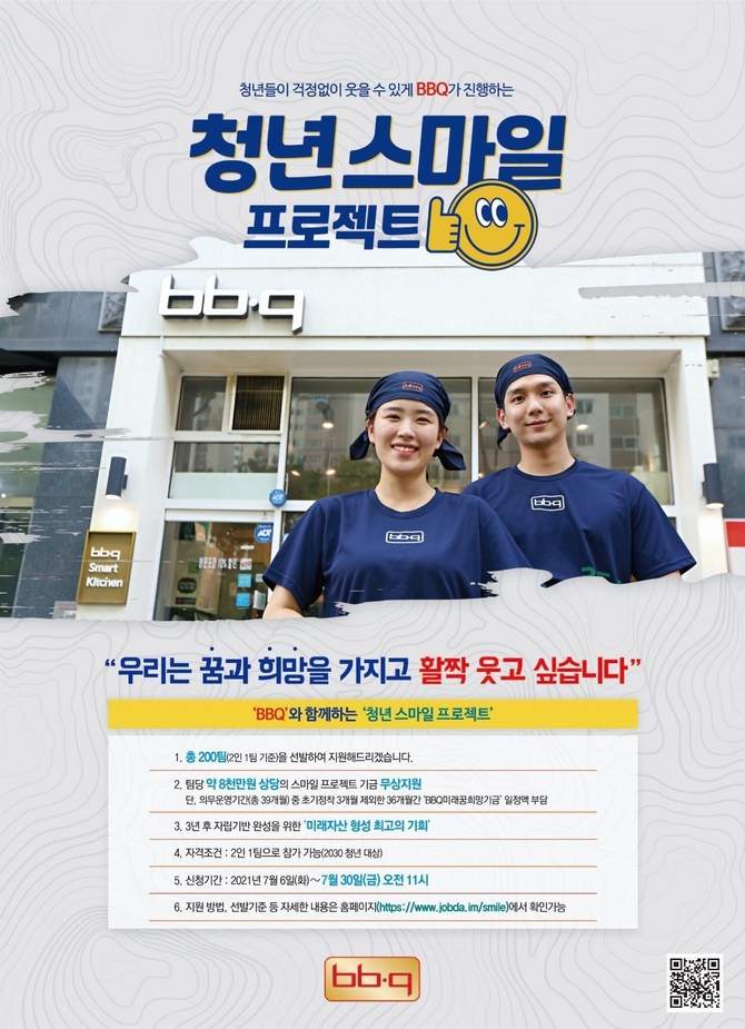 (Á¶¼¼±ÝÀ¶½Å¹®=±¸Àçȸ ±âÀÚ) ±¹³» ġŲ ÇÁ·£Â÷ÀÌÁî ±â¾÷ Á¦³Ê½Ã½ºBBQ±×·ìÀº Ãë¾÷³ µîÀ¸·Î ¾î·Á¿òÀ» °Þ´Â û³âÀ» ¼±¹ßÇØ ¸ÅÀåÀ» ¿ ¼ö ÀÖ°Ô ÇÏ´Â 'û³â ½º¸¶ÀÏ ÇÁ·ÎÁ§Æ®'¿¡ 200¾ï¿øÀ» Áö¿øÇÑ´Ù.