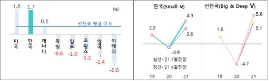 »óÇâ Á¶Á¤ÆøÀº ¼±Áø±¹ Æò±Õ(0.5%Æ÷ÀÎÆ®)º¸´Ù ³ô°í, ÁÖ¿ä 7°³±¹(G7) Áß ¿µ±¹(1.7%Æ÷ÀÎÆ®)°ú ij³ª´Ù(1.3%Æ÷ÀÎÆ®)¿¡ ÀÌ¾î ¼¼ ¹øÂ°·Î Å©´Ù. Çѱ¹ÀÇ ³»³â °æÁ¦ ¼ºÀå·üÀº 0.6%Æ÷ÀÎÆ® ¿Ã¸° 3.4%·Î Àü¸ÁÇß´Ù.