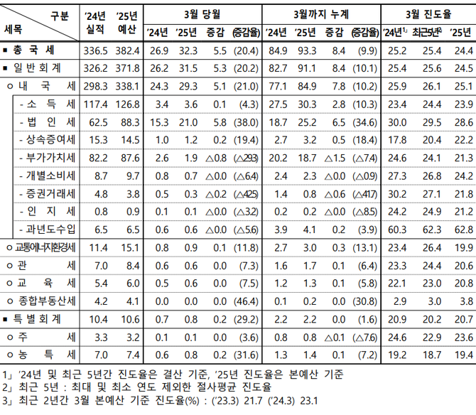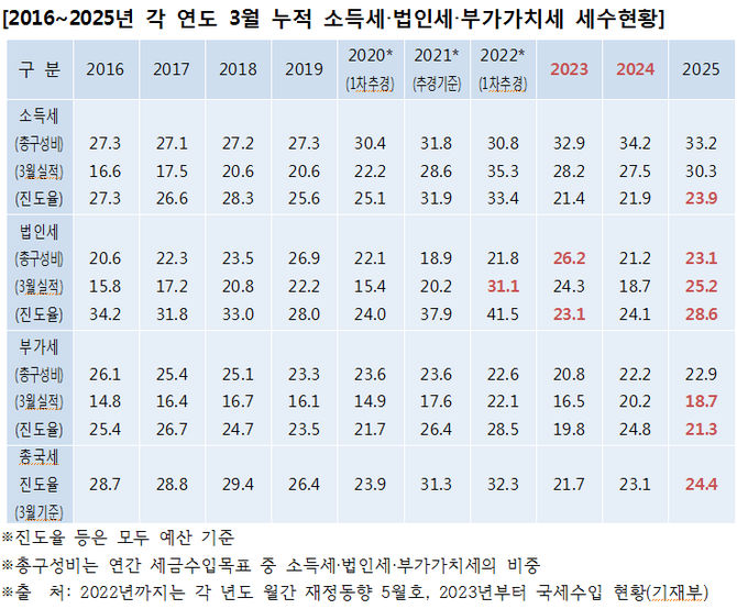 ±×·±µ¥ ¿ÃÇØ 3¿ù ¼Òµæ¼¼ ´©Àû ÁøµµÀ²Àº 23.9% ¼öÁØÀÌ´Ù. 2023~2024³â 3¿ù ´©Àûº¸´Ù¾ß ³´´ÙÁö¸¸, 2023³â°ú 2024³âÀº ¼Òµæ¼¼¿¡¼ ¿¬°£ ±âÁØ °¢°¢ -16.0Á¶, -8.3Á¶¿øÀÇ ÆãÅ©¸¦ ³Â¾ú´Ù.